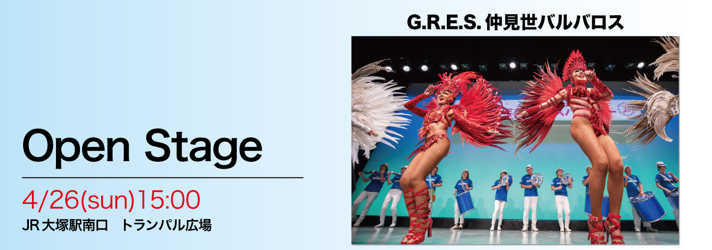 4月262026 G.R.E.S仲見世バルバロス オープンステージ G.R.E.S仲見世バルバロス 浅草サンバカーニバル優勝チーム 開催日時:4月26日(日)15:00〜 場所:JR大塚駅南口 駅前トランパル