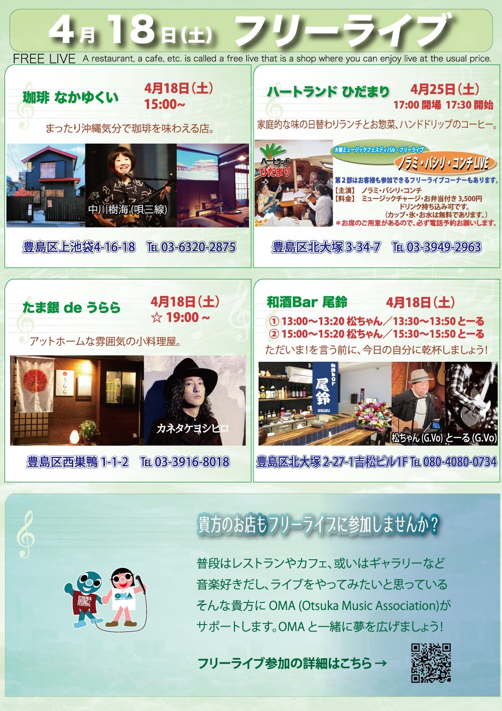 大塚ミュージックフェスティバルの「フリーライブ」では、いつもの居酒屋やカフェ、ライブハウスなどで各店が趣向を凝らしたライブを実施いたします。